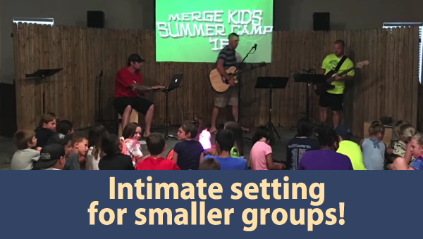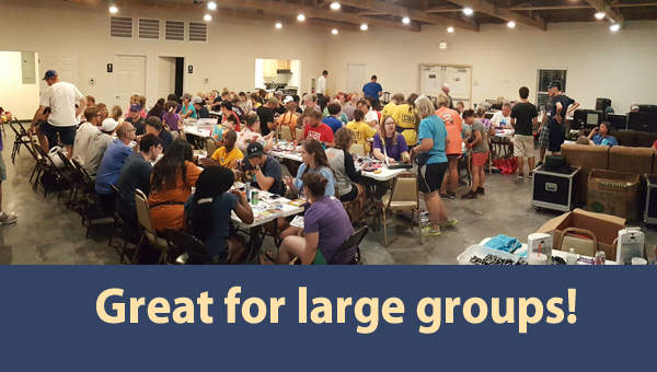 The Oak Room is an additional meeting room, ideally sized for groups ranging from 30-150, available since the summer of 2016. It is a 2,160 sq foot building, with a meeting room footprint of roughly 40’ x 45’. This room has been designed to seat at least 130 people at rectangular tables for our Royal Family Camps’ use; therefore, its polished concrete floors offer great versatility for a wide variety of event needs. The exposed trusses open up the atmosphere of the room, while the fabric lined insulation at the roof keeps the acoustics in check and pleasant! We have added an exterior antennae to bolster the Wi-Fi reception to hopefully help all aspects of your presentation go off without a hitch. A kitchenette with icemaker, large refrigerator, range, and kitchen sink enable this location to easily handle the convenience of low-key food staging. In addition, our front porch comes equipped with 4 perfect rocking chairs, to give you a chance to unwind and listen to the birds chirp and work on your rockin’ skills.